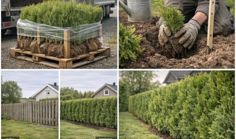 Lær å planlegge, plante og stelle tujahekk: riktig avstand, vanning, klipping, gjødsling og vinterbeskyttelse for en tett, varig hekk.