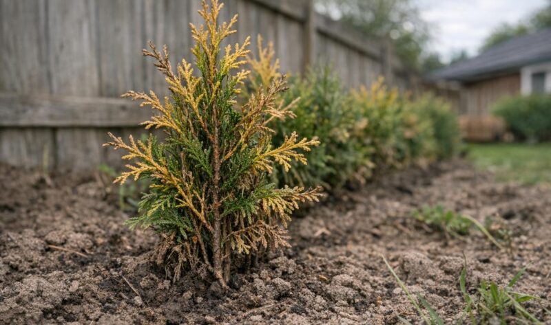 Praktiske råd for å identifisere og rette sju vanlige årsaker til treg vekst i thujahekk: jord, drenering, lys, vanning, avstand, næring og beskjæring.